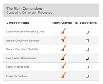 Thermo-chemical platforms gain most from reducing temperatures and pressures needed to convert the biomass. This reduces the need for expensive materials or fabrication techniques. A strength of thermo-chemical processes is that they convert all of the biomass, except minerals. As a result, any net gains from reduced energy consumption and process efficiency directly increase ethanol production as less of the biomass is used to power the process.